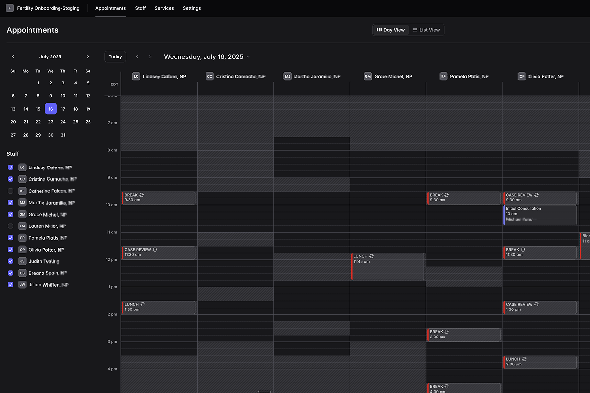 Integrated SavvyCal Appointments allows patients to book consultations immediately after intake. The scheduling system automatically syncs with provider calendars and respects complex availability rules specific to fertility treatment protocols.